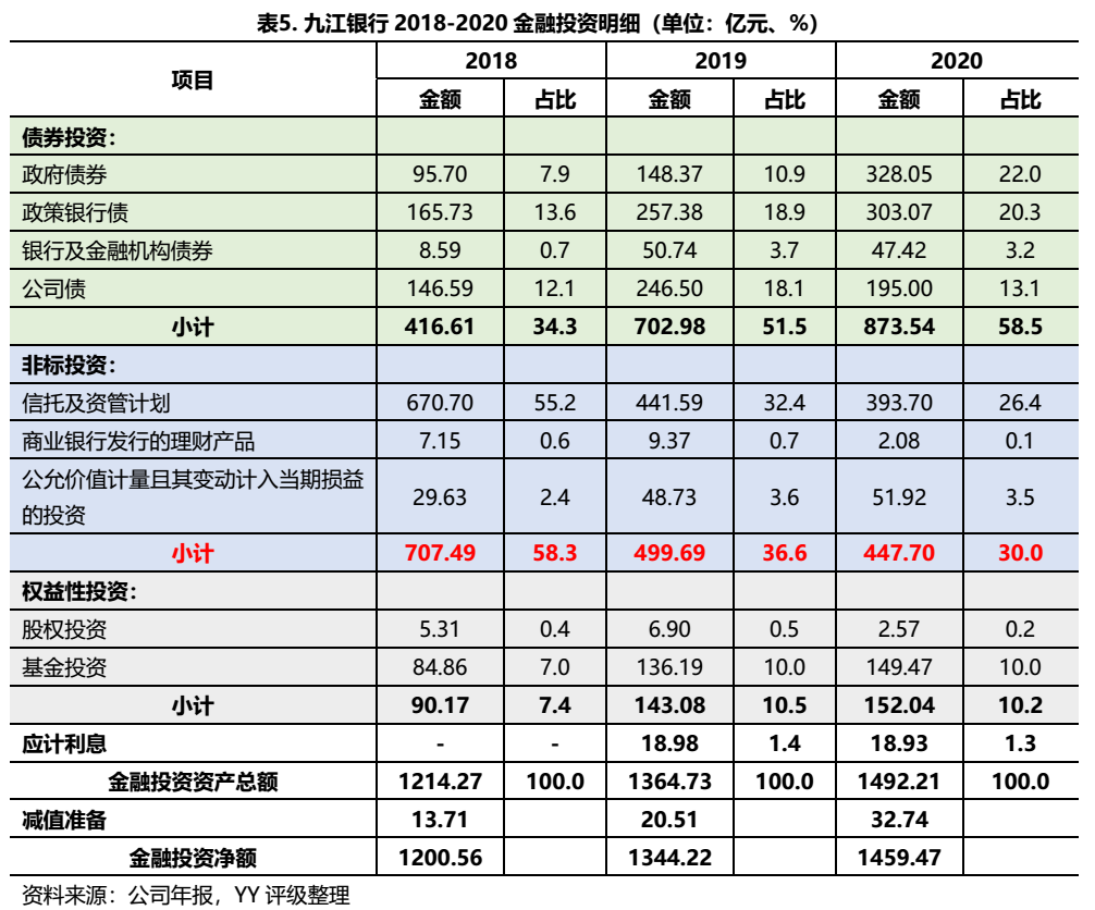 金融投資中的風(fēng)險主要體現(xiàn)在非標資產(chǎn)方面,盡管九江銀行已經(jīng)努力在壓降非標資產(chǎn),但規(guī)模仍然較大。目前非標資產(chǎn)的底層資產(chǎn)為信貸類投資、債券及債券公募基金、貨幣市場工具及貨幣市場公募基金等,行業(yè)主要分布在房地產(chǎn)、基礎(chǔ)設(shè)施建設(shè)、其他服務(wù)業(yè)和制造業(yè),與房地產(chǎn)相關(guān)的非標規(guī)模達到了103.22億元,非標資產(chǎn)風(fēng)險較高。