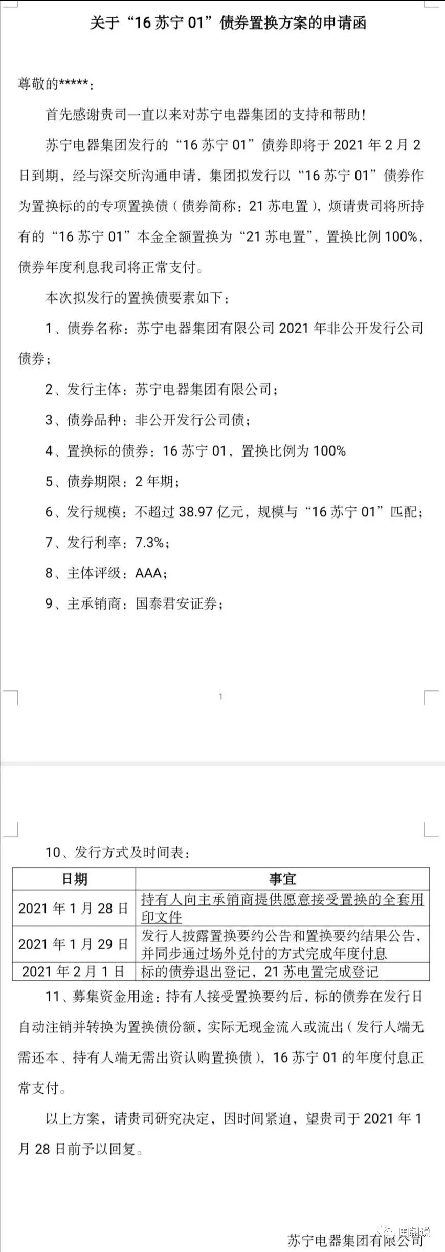 1月26日晚,一份《關(guān)于“16蘇寧01”債券置換方案的申請(qǐng)函》在各大群迅速傳播,引起廣泛關(guān)注,蘇寧在本月初提前兌付了100億債券后,似乎有點(diǎn)撐不住了。