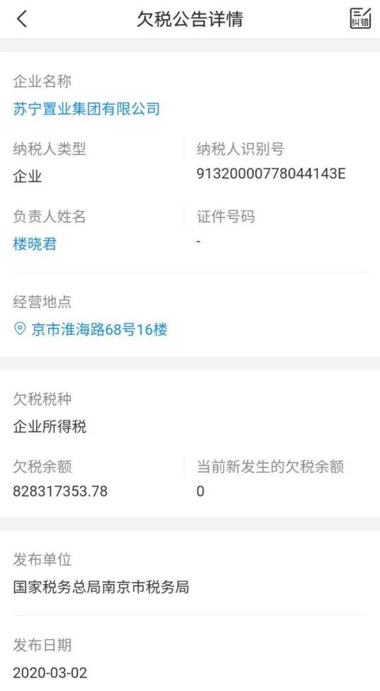 小編第一次關(guān)注到蘇寧,是源于去年3月份南京市稅務(wù)局發(fā)布的一份欠稅公告,截至到2019年12月31日,蘇寧置業(yè)拖欠企業(yè)所得稅8.28億。