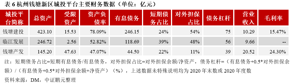 錢塘建投前身為杭州大江東投資開發(fā)有限公司,主要從事錢塘新區(qū)內(nèi)的基礎(chǔ)設(shè)施項目以及安置房的投資建設(shè),公司整體資產(chǎn)規(guī)模與負債水平均較高,2020年末有息債務(wù)規(guī)模達246.15億元,整體債務(wù)負擔較重。臨江發(fā)展主要負責臨江高新區(qū)的基礎(chǔ)設(shè)施建設(shè)和投融資業(yè)務(wù),同時負責蕭山臨江科創(chuàng)園、杭州灣出海碼頭的日常經(jīng)營,收入主要來源于園區(qū)委托的基礎(chǔ)設(shè)施項目代建,2020年末有息債務(wù)規(guī)模為118.69億元,其中短期債務(wù)占比為39%,短期償債壓力較大。錢塘產(chǎn)發(fā)是杭州經(jīng)濟技術(shù)開發(fā)區(qū)的主要城投平臺,從事所屬區(qū)域內(nèi)的工程施工、產(chǎn)業(yè)園區(qū)及商業(yè)服務(wù)、配套房地產(chǎn)等業(yè)務(wù),園區(qū)的物業(yè)租售是錢塘產(chǎn)發(fā)主要收入和利潤來源,受當?shù)胤康禺a(chǎn)租售市場行情影響較大;公司資產(chǎn)結(jié)構(gòu)以房產(chǎn)、存貨等為主,其中受限資產(chǎn)占比較高,整體資產(chǎn)流動性較弱,2020年末有息債務(wù)規(guī)模為44.50億元,債務(wù)杠桿水平不高。