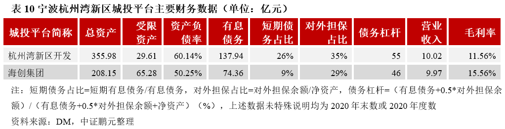 杭州灣新區(qū)開發(fā)為寧波杭州灣新區(qū)最主要發(fā)債平臺,主要從事所屬區(qū)域內(nèi)的基建、水務(wù)、物業(yè)經(jīng)營等業(yè)務(wù),收入主要來自木材貿(mào)易、基礎(chǔ)設(shè)施建設(shè)、供水和物業(yè)租賃板塊,基礎(chǔ)設(shè)施建設(shè)業(yè)務(wù)主要包括代建、政府購買服務(wù)以及 PPP 三種業(yè)務(wù)模式,業(yè)務(wù)委托方主要為寧波杭州灣新區(qū)開發(fā)建設(shè)管理委員會,目前公司盈利主要來自基礎(chǔ)設(shè)施代建與租賃業(yè)務(wù),貿(mào)易業(yè)務(wù)毛利率水平較低,供水板塊仍為虧損狀態(tài),業(yè)務(wù)運營主要依賴政府補貼;2020年末公司有息債務(wù)規(guī)模達137.94 億元,整體負債水平偏高。海創(chuàng)集團主要從事寧波杭州灣新區(qū)內(nèi)基建、物業(yè)租賃以及光伏發(fā)電業(yè)務(wù),2020年公司新增貿(mào)易板塊收入4.78億元,整體收入規(guī)模增長較快,公司盈利仍主要來自旗下物業(yè)租賃業(yè)務(wù);公司資產(chǎn)中受限資產(chǎn)占比較高,資產(chǎn)流動性較弱,2020年末有息債務(wù)規(guī)模為74.36億元,短期債務(wù)占比不高。