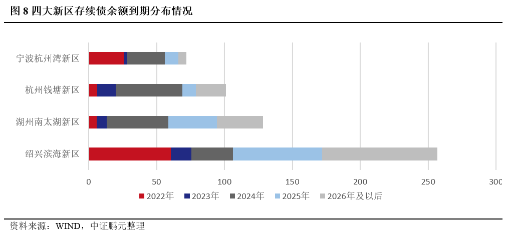 從城投平臺存量債到期時間分布看,2022-2025年和2026年及以后到期存續(xù)債占比分別為17.74%、6.89%、27.12%、21.84%和26.42%,整體分布較為均勻。其中,湖州南太湖新區(qū)與杭州錢塘新區(qū)2022年到期債券規(guī)模與占比均較小,到期時間段主要集中在2023年及以后年度;寧波杭州灣新區(qū)和紹興濱海新區(qū)2020年到期債券規(guī)模較大,面臨一定的短期償付壓力。