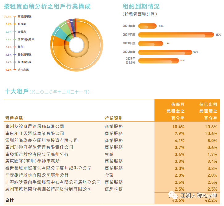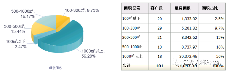 許多企業(yè)會統(tǒng)計不同行業(yè)或業(yè)態(tài)的客戶承租面積及占比,來分析影響自身項目穩(wěn)定性的客群特征;REITs經(jīng)常會按照承租面積來統(tǒng)計十大租戶,以識別哪些客戶對項目空間的影響程度大。