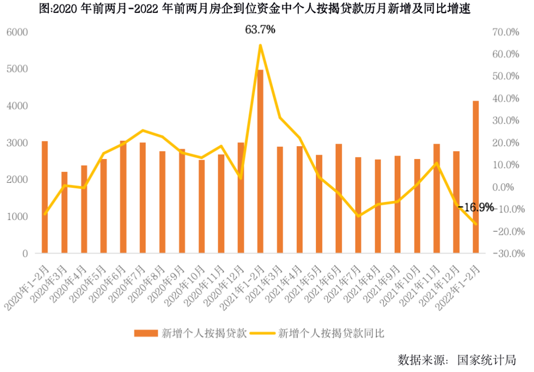 房地產開發(fā)企業(yè)各項到位資金中,個人按揭貸款同比跌幅進一步擴大。2021年12月,新增個人按揭貸款2755億元,同比轉跌8%。2022年1-2月,新增個人按揭貸款4124億元,同比下降16.9%,同比跌幅較2021年末擴大8.9個百分點。