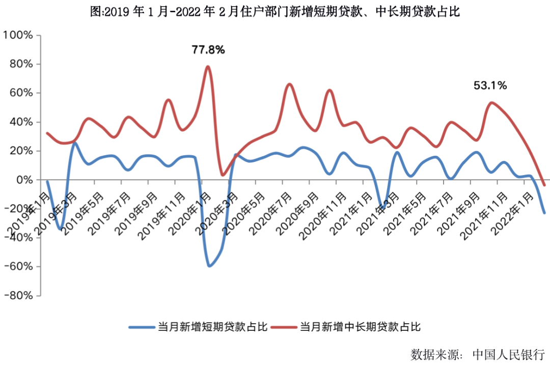 不過,居民實際按揭貸款顯著不及市場預期。2021年10月,住戶部門中長期貸款占比一度升至53.1%的高位,但隨后歷月占比持續(xù)走低。2022年2月,住戶部門短期貸款減少2911億元,中長期貸款減少459億元,住戶中長期貸款歷史首次出現負增長。