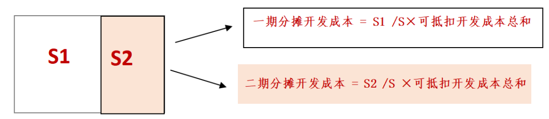 即轉讓土地使用權的面積占可轉讓土地使用權總面積的比例進行分攤;對于分期開發的項目,通常按照占地面積進行分攤,也就是用占地面積法來分攤每一個清算單元下的土地成本和工程成本。如下圖示意:S為項目總占地面積,分兩期開發S1和S2。