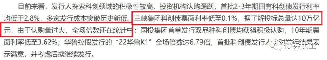 2022年5月20日,上海證券交易所印發(fā)了《上海證券交易所公司債券發(fā)行上市審核規(guī)則適用指引第4號(hào)——科技創(chuàng)新公司債券》,正式推出科技創(chuàng)新公司債券。科技創(chuàng)新公司債券推出之后,即得到了發(fā)行人和投資者的廣泛關(guān)注和認(rèn)可。根據(jù)證券日?qǐng)?bào)2022年5月29日的報(bào)道(http://www.zqrb.cn/stock/gupiaoyaowen/2022-05-29/A1653813408733.html),三峽集團(tuán)科創(chuàng)債票面利率低至0.1%,投標(biāo)總量達(dá)10萬(wàn)億元!!!