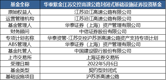 2022年5月6日,江蘇沿江高速公路有限公司作為原始權益人的“華泰紫金江蘇交控高速公路封閉式基礎設施證券投資基金”在上交所已受理!基礎設施項目類型為收費公路,項目名稱為滬蘇浙高速公路,高速公路收費經營權及相關資產組評估價值為295,110.00萬元,剩余年限約10.5年。本期產品基金管理人和ABS管理人為華泰證券(上海)資產管理有限公司,財務顧問為中信證券股份有限公司,托管行為中國建設銀行股份有限公司,原始權益人的控股股東為江蘇交通控股有限公司。