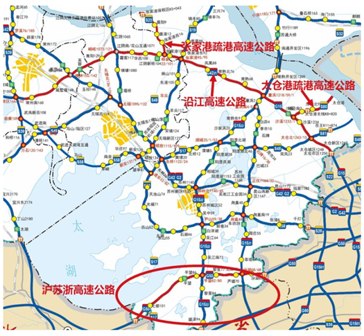 沿江高速公司的核心資產包括滬武高速公路(常州至太倉段)(簡稱“沿江高速公路”)、滬蘇浙高速公路、太倉港疏港高速公路和張家港疏港高速公路,所轄路段總里程超220公里。其中,沿江高速公路是江蘇省“七縱十橫十聯”高速公路網布局主骨架網(2017-2030年規劃)的重要組成部分,全長138.62公里,匝道約64公里,是江蘇省與上海市的主要出入通道之一,具有獨特的地域優勢。