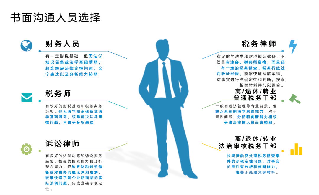 從上圖對比可看出,擁有注冊會計師、稅務師資格且有一定稅務稽查應對、稅務行政處罰聽證經(jīng)驗的稅務律師和長期在法治審核崗工作的離/退休/轉(zhuǎn)業(yè)稅務干部會是書面溝通的最佳人選,他們通常具備上述四項能力,能較好地處理事實到定性轉(zhuǎn)化的過程。