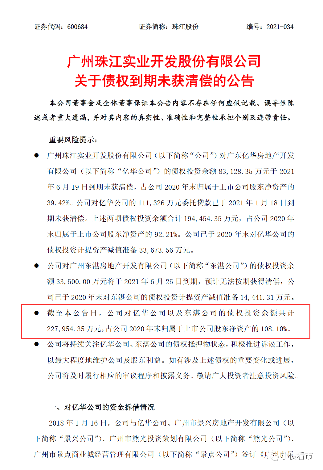 6月22日,珠江股份(600684.SH)公告稱,其對億華公司債權(quán)投資余額8.3億元于2021年6月19日到期后未獲清償。