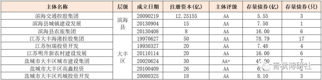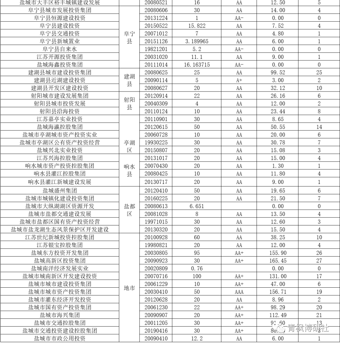 (三)目前江蘇鹽城地區有53家城投平臺,共有存量債券360只、債券余額為1789.04億元,要知道鹽城市一年的財政收入只有400多億元。特別是我們看到,江蘇鹽城大豐區目前有7只城投債券、余額合計為173.87億元,同樣表明大豐區的債務壓力較大。若考慮到鹽城地區的債務壓力本來就很多、市場認可度不高、融資成本明顯處于高位等因素,則基本可以判斷如果沒有金融體系的支持,或金融體系的支持不夠,意味著鹽城市及大豐區的債務壓力基本無解。
