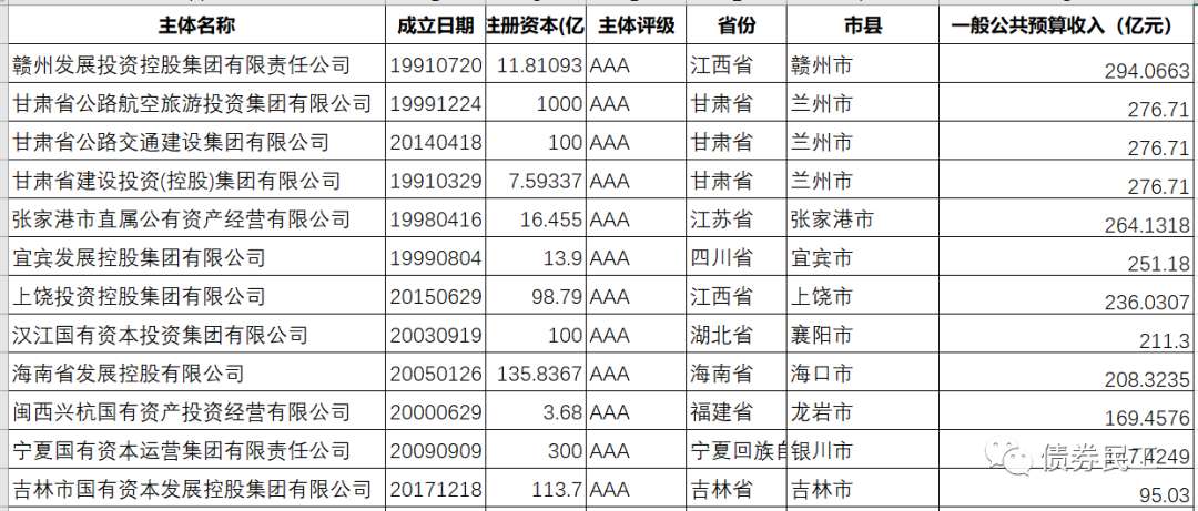 6、AAA城投公司所在區(qū)域的的一般預算收入情況。扣除掉直轄市和副省級城市,蘇州市是AAA城投公司一般預算收入數(shù)據(jù)最高的地級市;吉林市是AAA城投公司一般預算收入數(shù)據(jù)最低的地級市。目前共有12家城投公司所在區(qū)域的一般預算收入低于300億元。