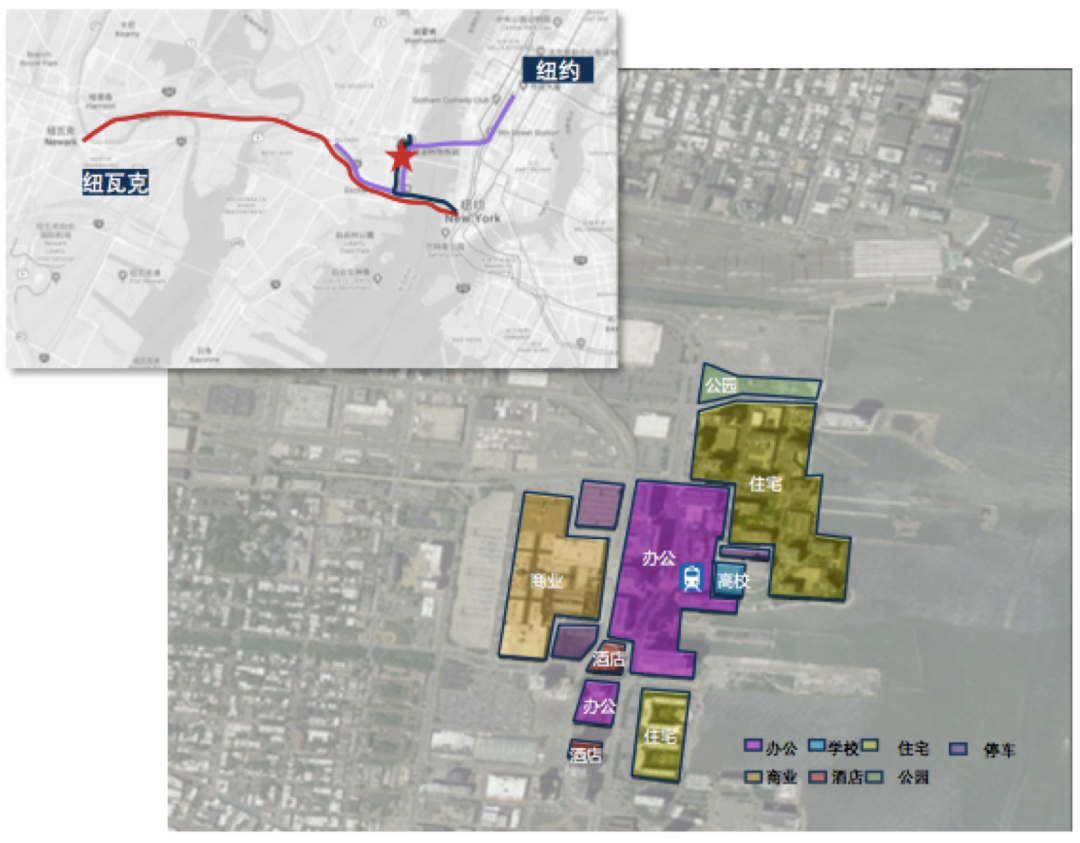 項(xiàng)目位于紐約與紐瓦克雙城交界處,雙地鐵共站;在設(shè)計(jì)上,站點(diǎn)優(yōu)先布局辦公和學(xué)校功能(學(xué)校與地鐵站共樓),極大程度吸引研發(fā)及辦公人群到達(dá);外圍配套商務(wù)人員所需的商業(yè)、公寓、酒店,延長(zhǎng)停留時(shí)間;同時(shí)利用濱水環(huán)境良好的資源優(yōu)勢(shì)建設(shè)住宅,吸引人群長(zhǎng)期居住。借鑒兩城交界的優(yōu)質(zhì)區(qū)位和雙地鐵的交通優(yōu)勢(shì),成為雙城人流、產(chǎn)業(yè)、貿(mào)易的交匯點(diǎn),通過(guò)商業(yè)和居住功能的完善吸引人口長(zhǎng)期居住。