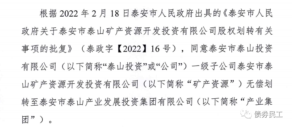 1、根據(jù)泰安市泰山投資有限公司(主體信用等級AA+)2022年2月21日的公告,將子公司泰安市泰山礦產(chǎn)資源開發(fā)投資有限公司無償劃轉(zhuǎn)至泰安市泰山產(chǎn)業(yè)發(fā)展投資集團有限公司。泰安市泰山產(chǎn)業(yè)發(fā)展投資集團有限公司未發(fā)行過債券。