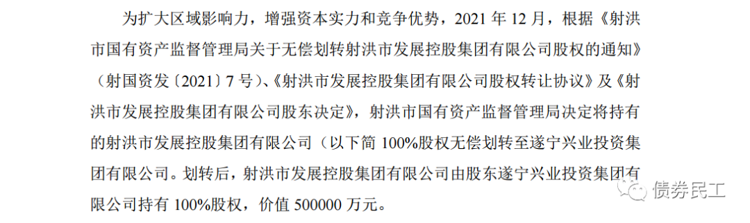 5、根據(jù)射洪市國有資產(chǎn)經(jīng)營管理集團有限公司(主體信用等級AA-)2022年1月28日的公告,射洪市國有資產(chǎn)監(jiān)督管理局決定將持有的射洪市發(fā)展控股集團有限公司100%股權(quán)無償劃轉(zhuǎn)至遂寧興業(yè)投資集團有限公司。遂寧興業(yè)投資集團有限公司未發(fā)行過債券。