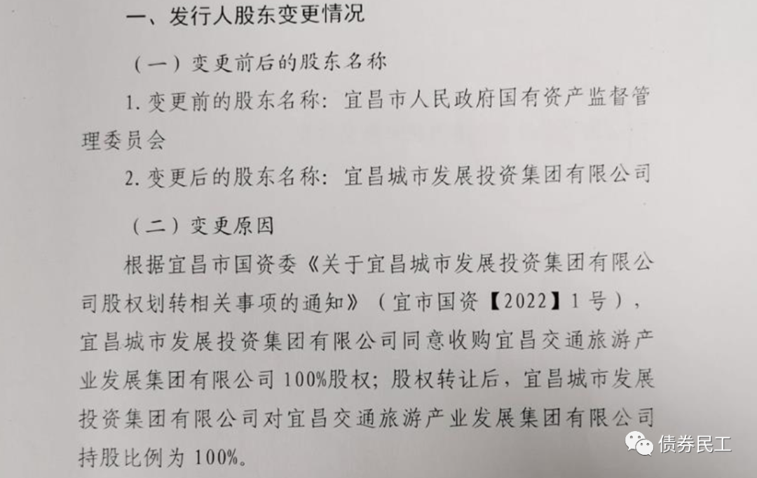 6、根據(jù)宜昌交通旅游產(chǎn)業(yè)發(fā)展集團有限公司(主體信用等級AA)2022年1月25日的公告,宜昌城市發(fā)展投資集團同意收購宜昌交通旅游產(chǎn)業(yè)發(fā)展集團100%股權(quán);股權(quán)轉(zhuǎn)讓后,宜昌城市發(fā)展投資集團對公司的股權(quán)比例為100%。宜昌城市發(fā)展投資集團(主體信用等級AA+),存續(xù)債券金額164.50億元。