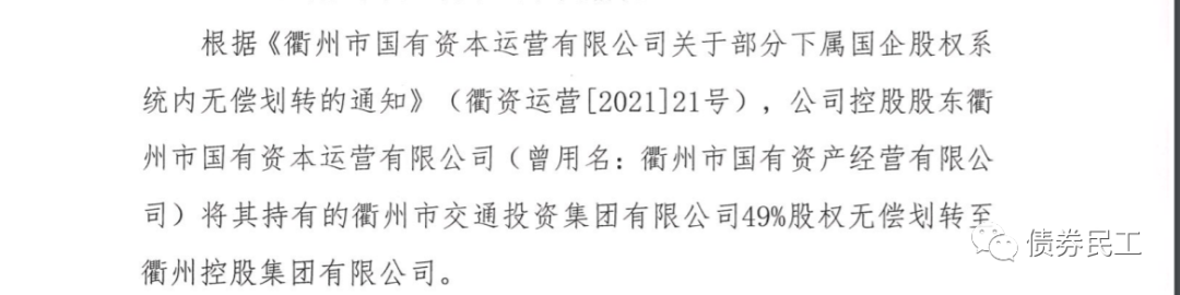 8、根據(jù)衢州市交通投資集團有限公司(主體信用等級AA+)2022年1月17的公告,公司控股股東衢州市國有資本運營有限公司將其持有的公司49%股權(quán)無償劃轉(zhuǎn)至衢州控股集團有限公司。衢州市國有資本運營有限公司(主體信用等級AA+),存量債券金額為106.50億元。