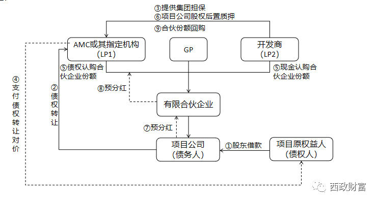 2.AMC或其指定主體與開發商共同設立有限合伙企業,合伙企業的GP由AMC指定,AMC或其指定主體以收購的項目原權益人的債權認購有限合伙企業的份額,開發商以現金認購有限合伙企業的份額,具體份額比例可另行協商,有限合伙收購項目公司股權之后做后置質押。