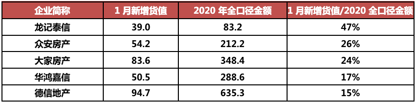 整體投資偏謹慎的情況下,仍有部分房企在2021年1月加速拿地,典型如龍記泰信、眾安、大家等房企,新增貨值幾乎是企業2020年全口徑銷售金額的30%,其中龍記泰信更是接近50%。如果一季度土地投資能夠在下半年形成可售貨值,那么此類房企1月積極納儲將對今年業績增長起到有力支撐。