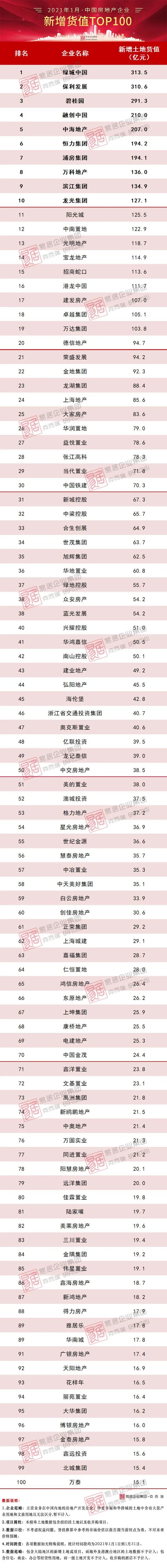 2021年1月,新增貨值百強門檻為15.1億,較去年同期增加1.8億。新增貨值TOP10基本被規模房企所占據,其中綠城、保利、碧桂園位列新增貨值TOP3,這些企業投資鋪排動作迅速。
