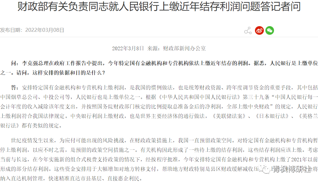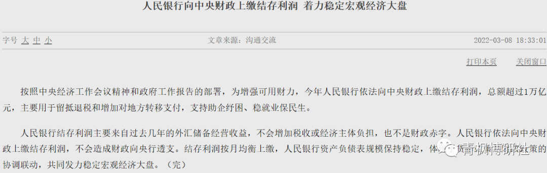 2022年3月8日,針對央行向中央財政上繳結(jié)存利潤超1萬億元這一事件,央行和財政部積極進行回應,并引發(fā)熱議。本文嘗試對該主題進行討論分析,