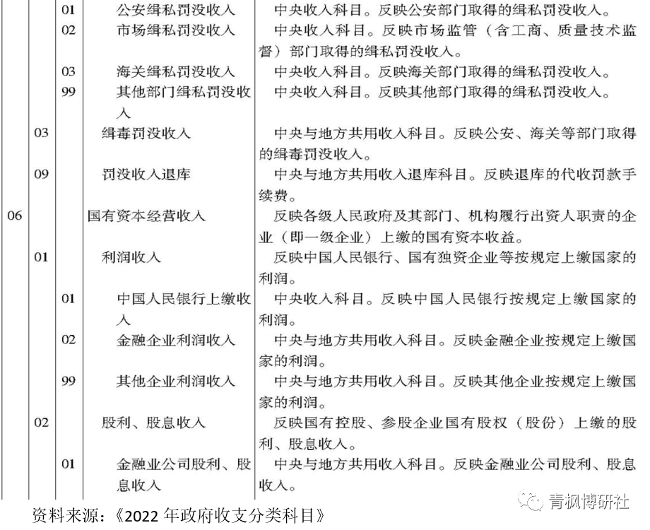 2021年10月18日,財政部發(fā)布的《2022年政府收支分類科目》對央行、金融企業(yè)及其它企業(yè)上繳利潤情況單列了科目,將其歸為“國有資本經(jīng)營收入——利潤收入”之塊,即國有資本經(jīng)營收入的利潤收入部分包括中國人民銀行上繳收入、金融企業(yè)利潤收和其他企業(yè)利潤三大塊。