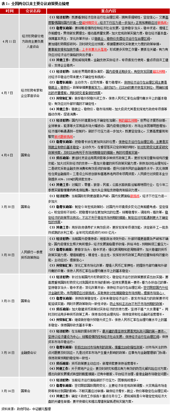 隨著國內(nèi)外形勢出現(xiàn)的超預期變化,穩(wěn)增長政策更加明確和直白。326金融委會議指出積極出臺對市場有利的政策,慎重出臺收縮性政策;3月21日國常會強調(diào)防止和糾正出臺不利于市場預期的政策;3月30日國常會要求穩(wěn)定經(jīng)濟的政策早出快出,不出不利于穩(wěn)定市場預期的措施,開始提出要制定應對可能遇到更大不確定性的預案。4月6日國常會和最近兩次座談會對穩(wěn)增長政策表述更是直截了當,有的可提前實施,靠前發(fā)力、適時加力,已出臺的要盡快落實到位,明確擬推出的盡量提前,同時研究準備新的預案,上半年要大頭落地。