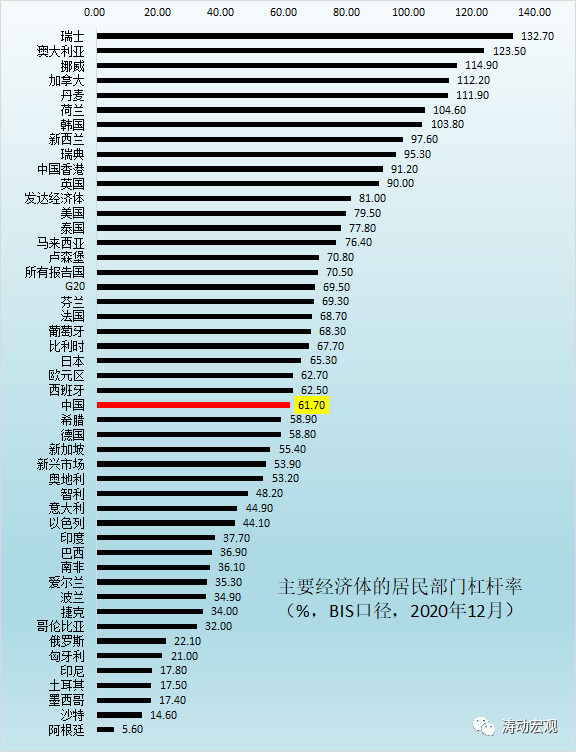 1、2020年12月中國居民部門的杠桿率為61.70%,和德國的58.80%基本相當(dāng),低于日本的65.30%和美國的79.50%,高于新興市場的53.90%。因此從數(shù)值上看似乎中國居民部門的宏觀杠桿率比較適中。但從央行公布的數(shù)據(jù)來看,BIS口徑下的居民部門杠桿率存在明顯低估,若以央行口徑來說,中國居民部門杠桿率2020年已達(dá)到72.50%,較美國僅低7個百分點(diǎn)。