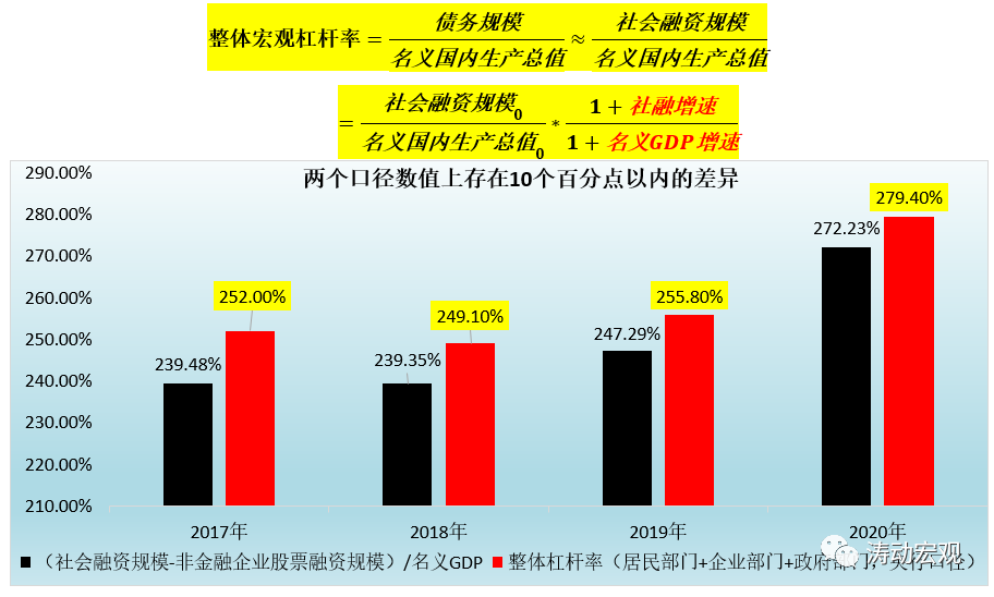 2、顯然我們可以基于社會融資規(guī)模指標(biāo)(剔除股票融資)來計(jì)算對應(yīng)宏觀杠桿率,并與央行口徑下的宏觀杠桿率進(jìn)行對比,結(jié)果發(fā)現(xiàn)二者在數(shù)值上約存在10個百分點(diǎn)以內(nèi)的差異,這意味著剔除股票融資后的社會融資規(guī)模與實(shí)體經(jīng)濟(jì)承受的整體債務(wù)水平還存在一定的差異。不過這種差異比較穩(wěn)定,說明社會融資規(guī)模指標(biāo)具有一定代表性,未來社會融資規(guī)模指標(biāo)口徑上還需要擴(kuò)容,以匹配宏觀杠桿率指標(biāo)的計(jì)算,畢竟社會融資規(guī)模指標(biāo)代表著實(shí)體經(jīng)濟(jì)從金融體系獲得的資金,其內(nèi)涵中便包括實(shí)體經(jīng)濟(jì)承擔(dān)的債務(wù)規(guī)模。