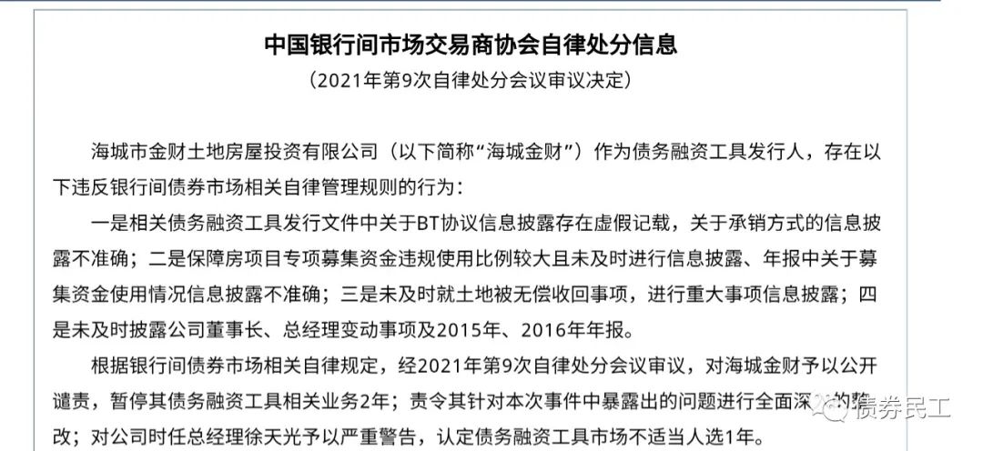 2021年6月18日,交易商協會同日對郵儲銀行和浙商銀行進行了自律處分,同時被自律處分的還有債券發行人海城市金財土地房屋投資有限公司(以下簡稱“海城金財”)。