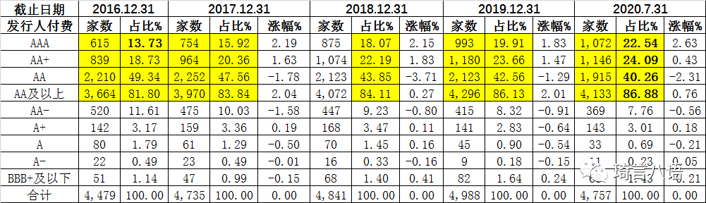 但在信用等級符號及定義未變的情況下,發(fā)債主體的信用等級卻不斷走高,AA及以上占比從2016年12月31日的81.80%升至2020年7月31日的86.88%,其中AAA評級占比提升幅度最為明顯,從13.73%升至22.54%。按此趨勢,明年市場上AAA評級占比將趕超AA+。