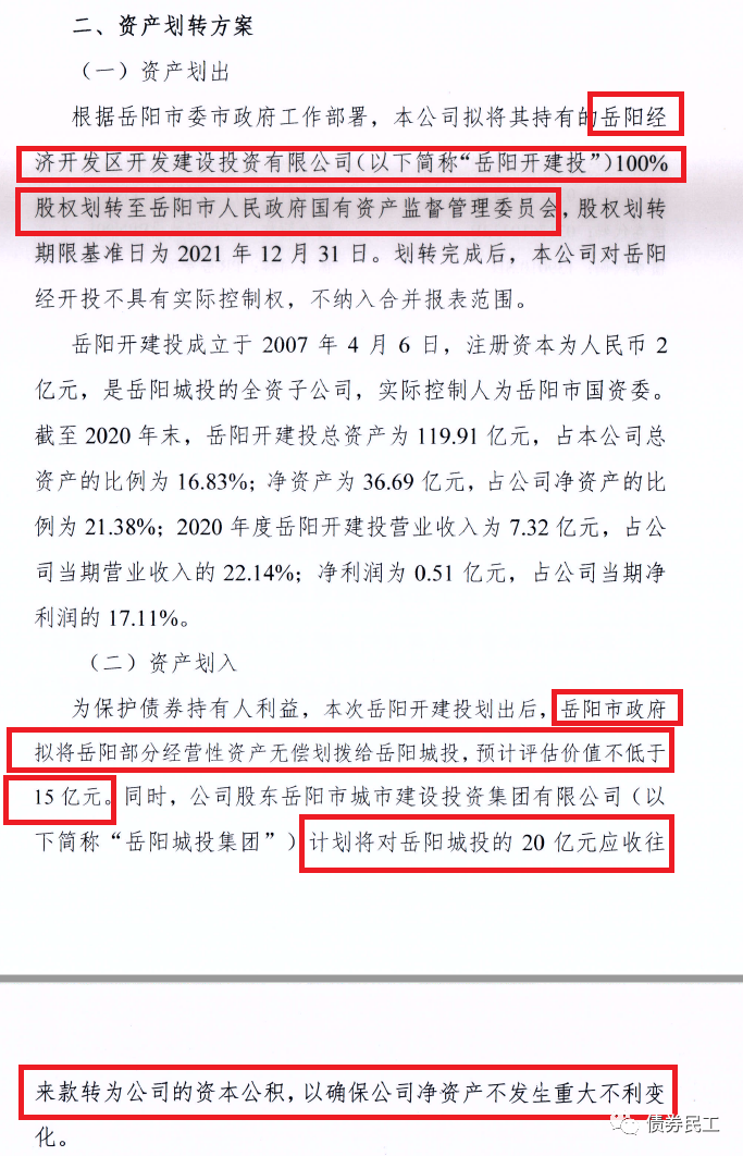 2、岳陽市城市建設投資有限公司公告,將公司持有的岳陽經濟開發區開發建設投資有限公司的股權無償劃轉給岳陽市國資委。與此同時,岳陽市政府擬將部分資產劃轉給岳陽市城市建設投資有限公司,保障公司的盈利能力和償債能力不受此次資產無償劃轉的影響。