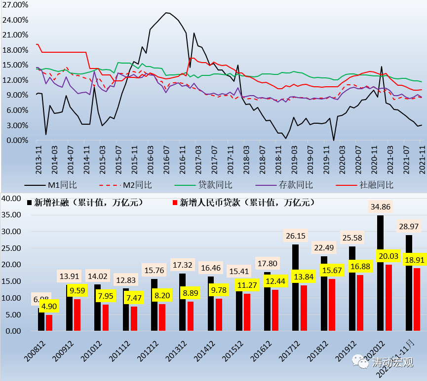 數(shù)據(jù)上看,今年11月M2同比與社融存量同比增速分別為8.50%和10.10%,前者環(huán)比下降0.20個(gè)百分點(diǎn),后者環(huán)比上升0.10個(gè)百分點(diǎn)。近三個(gè)月,M2同比增速與社融存量同比增速的平均值分別為8.50%和10.03%,和11月的8.50%和10.10%比較接近,若要考慮穩(wěn)增長(zhǎng)相關(guān)政策的支撐作用,結(jié)構(gòu)性寬信用的背景下,預(yù)計(jì)2022年M2與社融增速應(yīng)分別會(huì)在8.50%與10.50%左右。