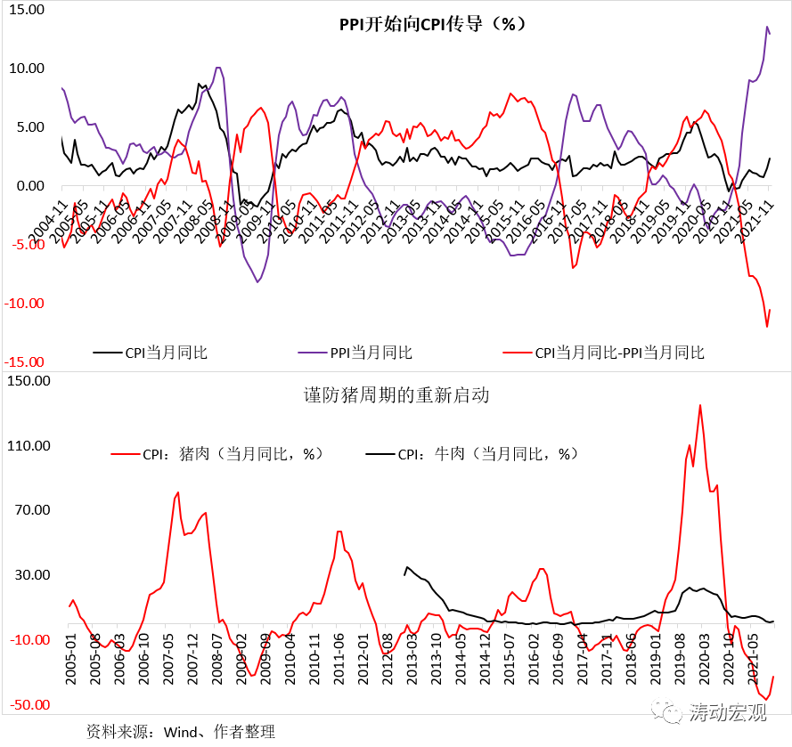 大宗商品價(jià)格上行導(dǎo)致生產(chǎn)成本處于高位是這一段時(shí)期以來的聚焦點(diǎn),而11月數(shù)據(jù)顯示PPI與CPI之間的剪刀差在繼續(xù)擴(kuò)大之后呈現(xiàn)出一定緩和的態(tài)勢(shì),而PPI已經(jīng)開始向CPI傳導(dǎo)。具體,今年11月當(dāng)月,CPI同比已經(jīng)連續(xù)兩個(gè)月回升至2.30%,PPI同比則進(jìn)一步回落至12.90%但仍處在高位水平,這表明不僅生產(chǎn)端的成本壓力愈發(fā)突出,消費(fèi)端的壓力實(shí)際上也開始體現(xiàn)。特別是,2022年需要對(duì)豬周期的反轉(zhuǎn)有一定心理準(zhǔn)備。