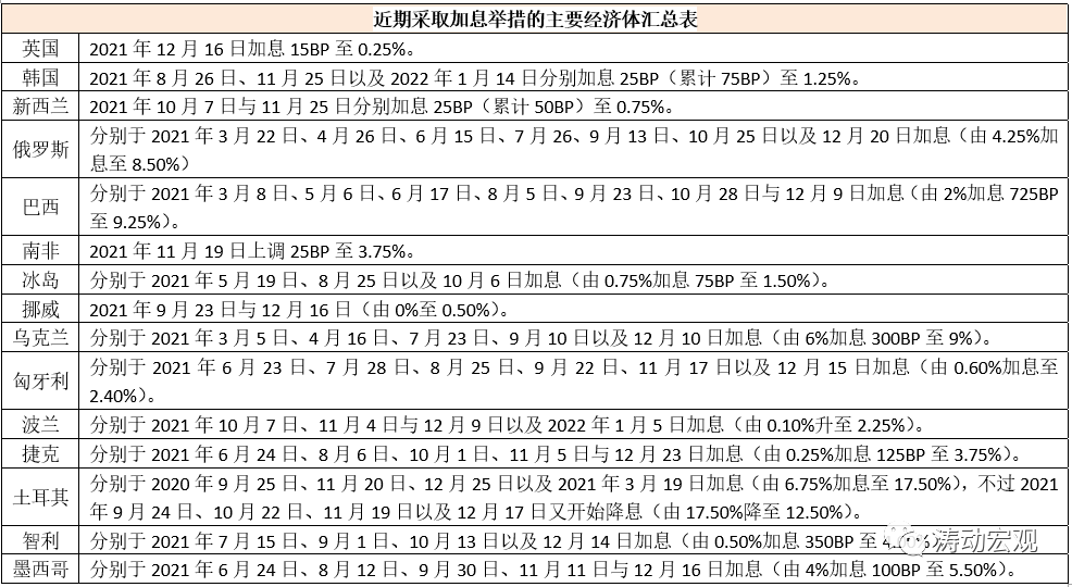 站在當(dāng)前來看,和上一輪美聯(lián)儲政策收緊過程相比,本輪最大的差異在于國內(nèi)貨幣政策的自主性以及監(jiān)管政策的高壓性更為突出,同時中國也在匯率方面也有更大的操作彈性和容忍度、通脹對貨幣政策的制約力度明顯下降等。這意味著,當(dāng)美聯(lián)儲Taper進程加快、加息與縮表步伐提前時,中國政策松一松的窗口期實際上是變得更短了,也更緊迫了。畢竟在美聯(lián)儲Taper加快的這段時期,中國經(jīng)濟又出現(xiàn)了新的下行壓力,穩(wěn)增長壓力正變得越來越突出,中國需要在美聯(lián)儲正式加息之前呵護好國內(nèi)經(jīng)濟基本面。特別是我們看到,2021年11月以來,已有英國、韓國、新西蘭、巴西、南非、烏克蘭、匈牙利、波蘭、捷克、智利和墨西哥等經(jīng)濟選擇加息,既包括發(fā)展中國家,也包括韓國和新西蘭等發(fā)達經(jīng)濟體。