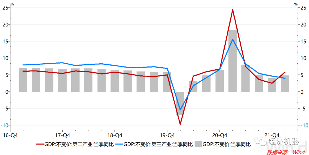 分行業(yè)看,第二產(chǎn)業(yè)增速顯著提升,是GDP提速的主要拉動項。一季度第二產(chǎn)業(yè)GDP同比增速為5.8%較上季度提升3.3個百分點;第三產(chǎn)業(yè)GDP同比增速為4.0%,較上季度下滑0.6個百分點。第三產(chǎn)業(yè)的下滑可能主要到受疫情影響。春節(jié)過后,我國多地疫情爆發(fā)。特別是上海、深圳等大型樞紐城市,鐵路運輸、航空運輸、住宿、餐飲等接觸性聚集性行業(yè)受到較大的沖擊。