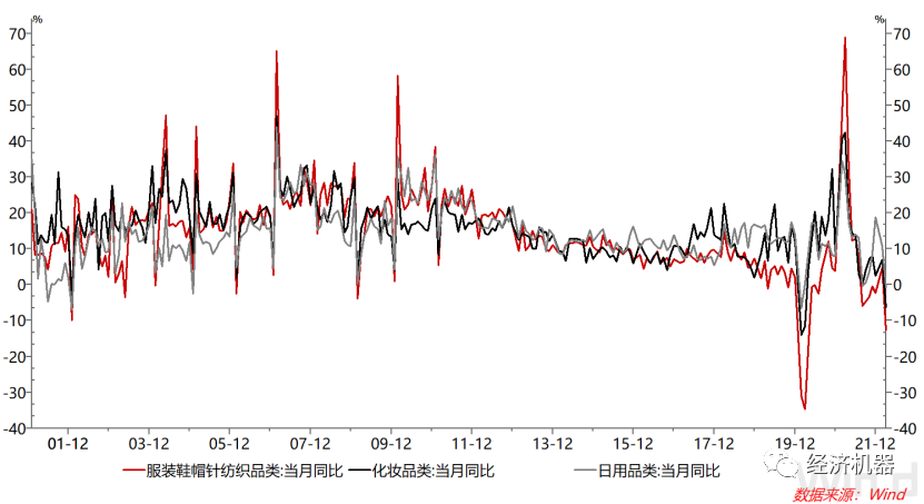 必選消費分項也繼續(xù)回落。服裝鞋帽類同比下滑12.7%,前值增長4.8%;化妝品類同比下滑6.3%,前值增長7%;日用品下滑0.8%,前值增長10.7%。