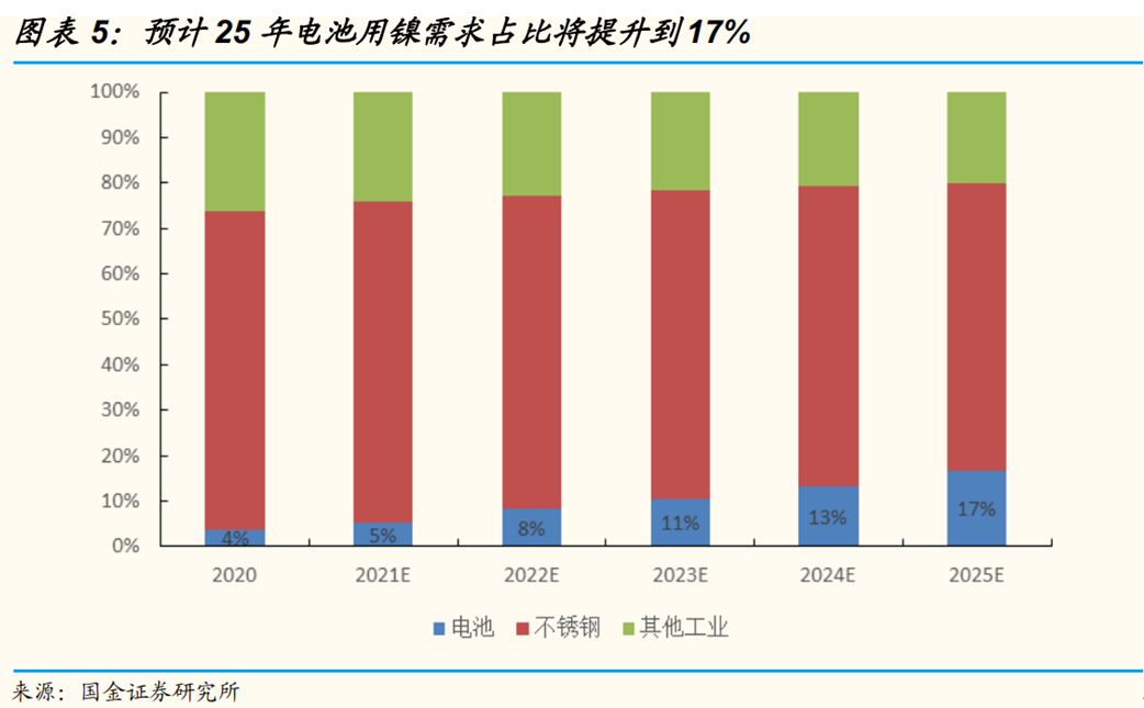 預計25年電池領域用鎳需求將達到58萬噸,5年CAGR=48.62%,需求占比將從20年的3%提升到25年的17%。