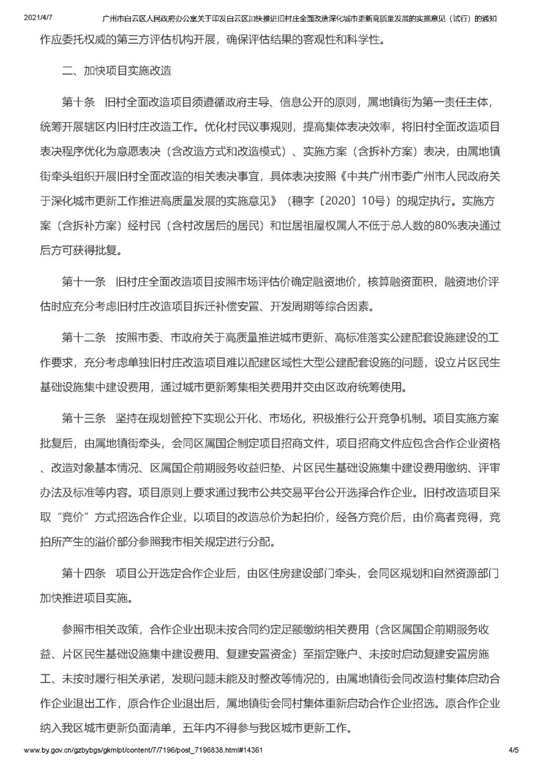 政策明確規定鼓勵區屬國企參與舊村莊全面改造前期工作。根據白云區舊改新政第三條規定,白云區后續舊村莊全面改造鼓勵區屬國企參與前期工作,與此前的《征求意見稿》相比,刪除了“重點區域”的相關表述,且舊改新政第十條規定意愿表決、實施方案表決由屬地鎮街牽頭組織開展表決。