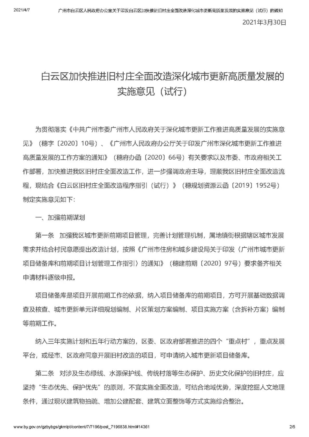 2021年3月30日,廣州市白云區人民政府主動公開了《關于印發白云區加快推進舊村莊全面改造深化城市更新高質量發展的實施意見(試行)》(云府辦[2021]43號文,以下簡稱“白云區舊改新政”),該份政策經歷了多輪修改并征求意見,充分體現了白云區政府在政策制定方面的科學嚴謹,而白云區舊改新政的正式頒布,也為后續白云區舊村莊改造指明了方向。法務中心對白云區舊改新政的政策解讀如下,并通過政策解讀為后續白云區城市更新項目拓展和推進提出如下建議。