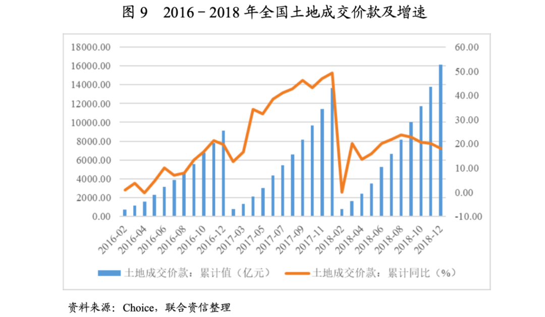 土地市場方面,隨著房地產市場政策趨緊,房企拿地普遍持謹慎態度。據中指研究院數據,2018年全國300個城市共推出各類用地12.84億平方米,同比增長20%;土地成交量10.55億平方米,同比增長14%。進入2018年以來,土地出讓政策頻出,部分城市限房價、限地價、競自持、競配建等土地出讓條件嚴苛,房企的利潤空間被壓縮;同時,限購、限貸款等調控城市范圍增大,部份購房需求被抑制,銷售增速放緩,房企回款壓力較大;加之房企融資渠道持續收緊,拿地更趨理性,土地成交規模增速不及供地增速,土地流拍情況較2017年明顯增加。價格方面,2018年,全國土地成交價款1.61萬億元,同比增長18.00%,增速同比減少31.40個百分點;300個城市成交樓面均價為2156元/平方米,同比下跌11%;平均溢價率為13%,同比下降16個百分點。但部分房企為沖規模,依然高溢價拿地,部分高溢價項目樓面地價接近政府限價。