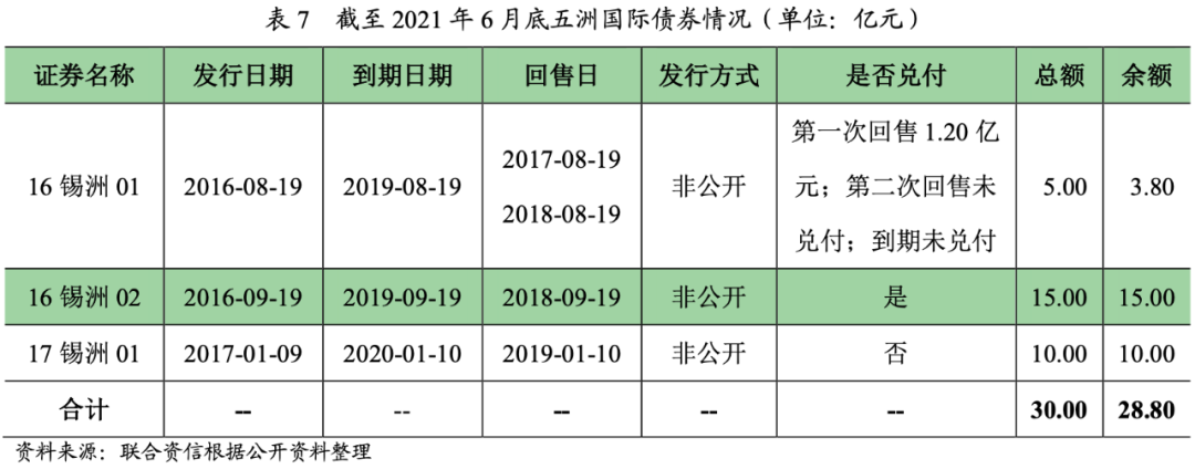 五洲國際以商業地產開發為主業,電商的快速發展對商貿城業務模式形成明顯沖擊、房地產行業政策持續收緊亦使其外部環境惡化;項目區域分布較差及項目自身開發周期長使得去化放緩,經營性現金流持續為凈流出;疊加承債式發展使得債務規模持續增長且短期債務規模較大,資金鏈緊張,最終導致債務違約。“16錫洲01”未于2018年8月19日償付回售的本金和利息,五洲國際構成了實質性違約,其后15億元的“16錫洲02”和10億元“17錫洲01”相繼違約,截至2021年6月底,五洲國際違約金額共計28.80億元。