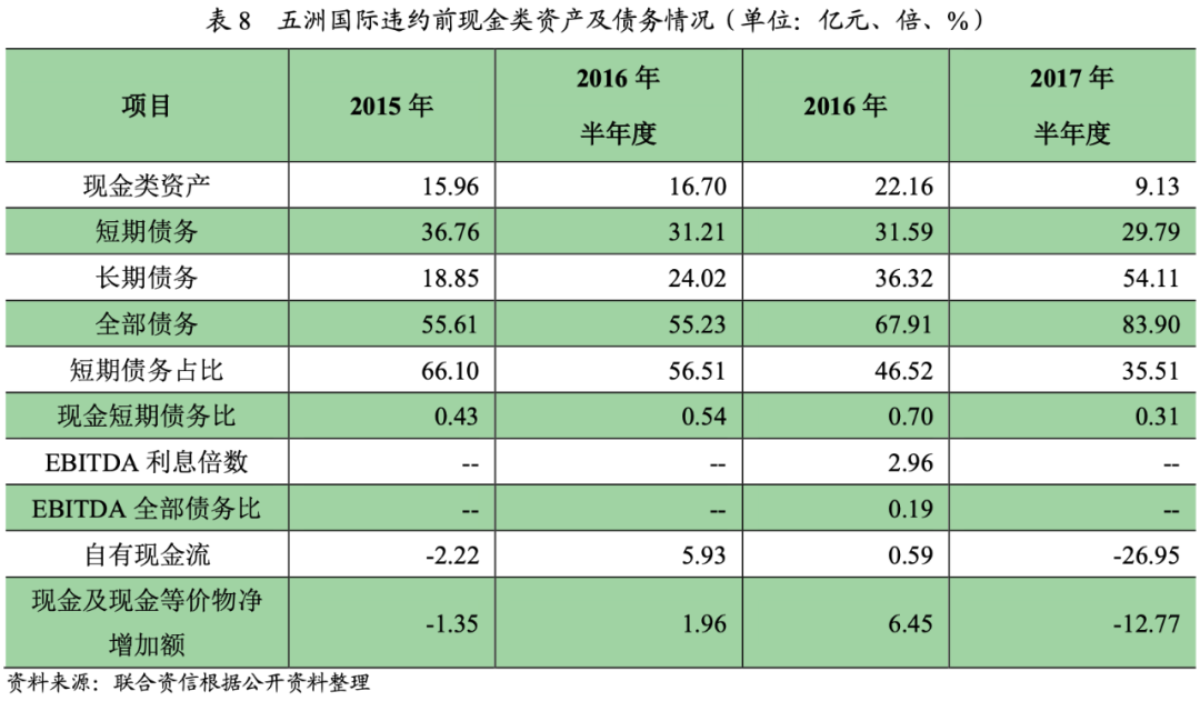 2018年7月5日,五洲控股已發生債務違約,控股股東雖然為五洲國際債務提供擔保,但自身收入下滑,盈利虧損,經營活動現金流量凈額持續為負,自身償債能力不足,對五洲國際債務已無擔保能力。