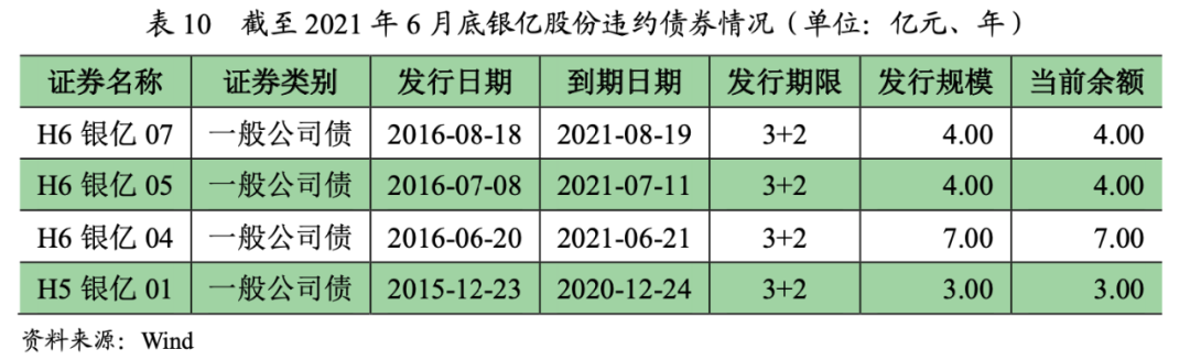 截至2021年6月底,銀億股份存續4只債券均已發生實質性違約,累計金額18.00億元。債券均設有回售條款,其中“H5銀億01”在回售日(2018年12月24日)因無法按時兌付本息發生實質性違約,后其他存量債券相繼發生違約。
