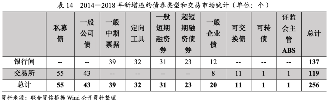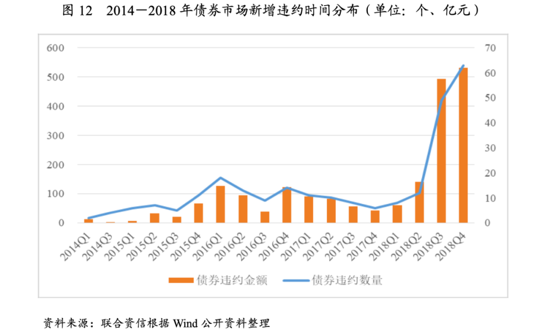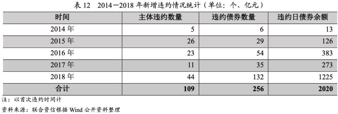 自2014年1月1日至2018年12月31日,交易所和銀行間市場共計109個主體違約,涉及256只債券,違約主體數量和違約日債券余額整體呈波動增長態勢,其中2017年由于產能過剩、行業盈利和融資環境好轉,新增違約情況有所下降,2018年由于外部信用環境收縮,債券市場違約數量和涉及的債券規模遠超往年,且單個違約發行人涉及的債券規模高。
