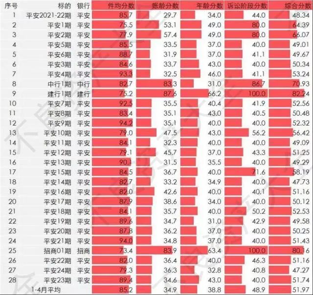 從我們的評分模型來看,1-4月共28期銀行個貸不良資產質量大部分不及格。平均綜合得分為51.97分。