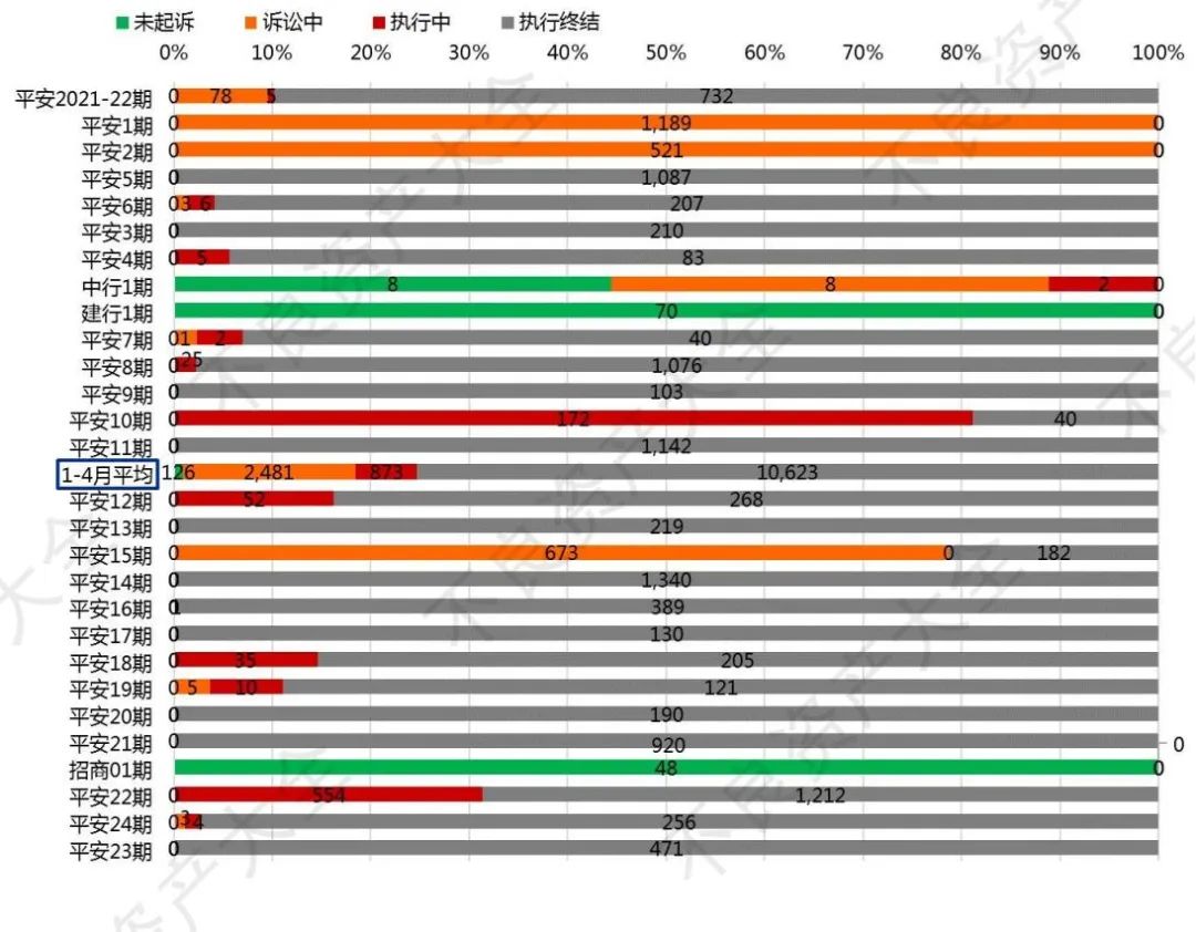 平均而言在共計14,067戶不良貸款中,未起訴、訴訟中、執行中及執行終結的分別有126戶、2,481戶、873戶及10,623戶,分別占總戶數的0.9%、17.6%、6.2%及75.5%。由于平安銀行的加持,以債務人角度看四分之三以上的不良資產均已終本。