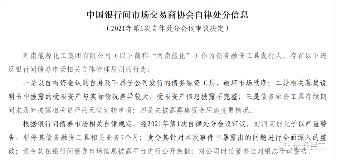 2020年11月10日,永煤集團電發行的“20永煤SCP003”意外違約,在信用債券市場上引發了極大的關注。永煤集團及相關中介機構相繼收到了監管機構的處分。在上海證券交易所的此次紀律處分之前的2021年1月14日,交易商協會對永煤集團予以公開譴責,暫停其債務融資工具相關業務1年。