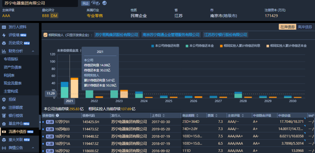 蘇寧電器境內債當前存續295.83億,相同實控人當前存續137.69億。今年到期量超百億(含相同實控人)。